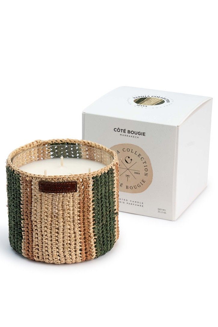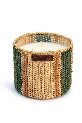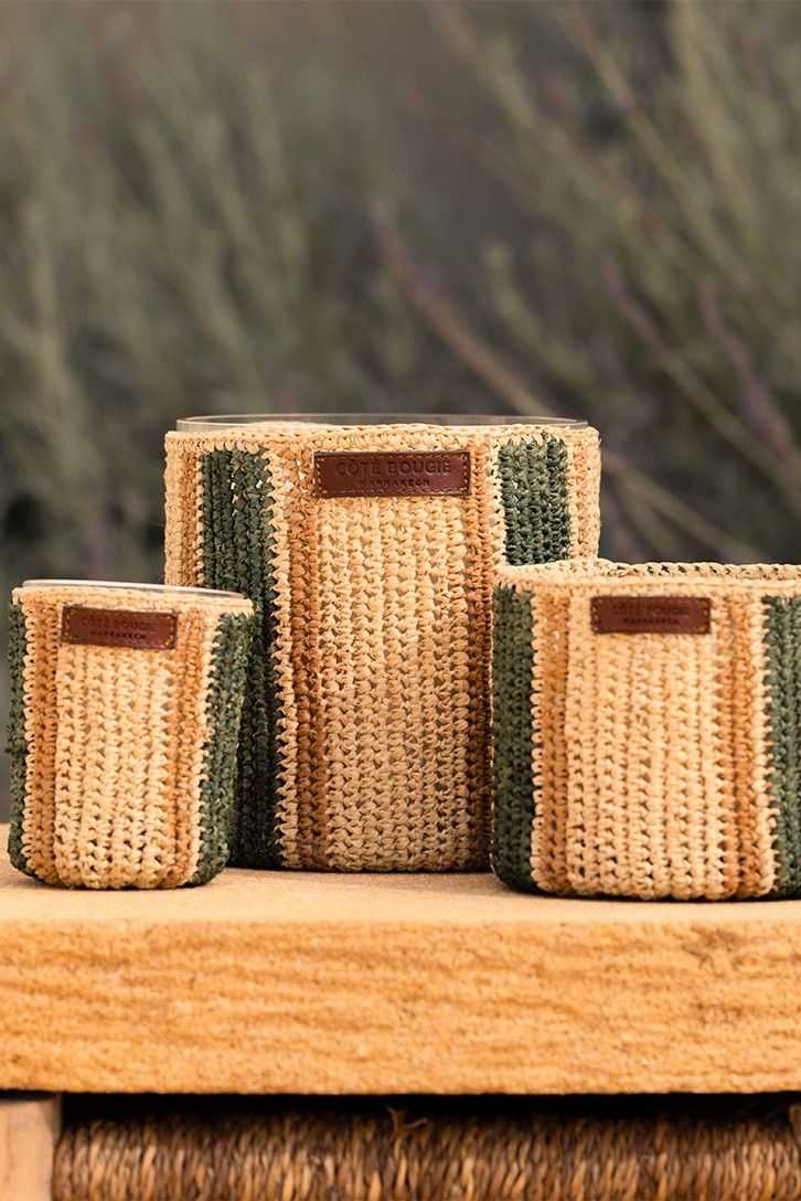 Bougie habillé en rafia, disponible en S et en M. La bougie libère une odeur de menthé et thé, il habillera également votre intérieur.