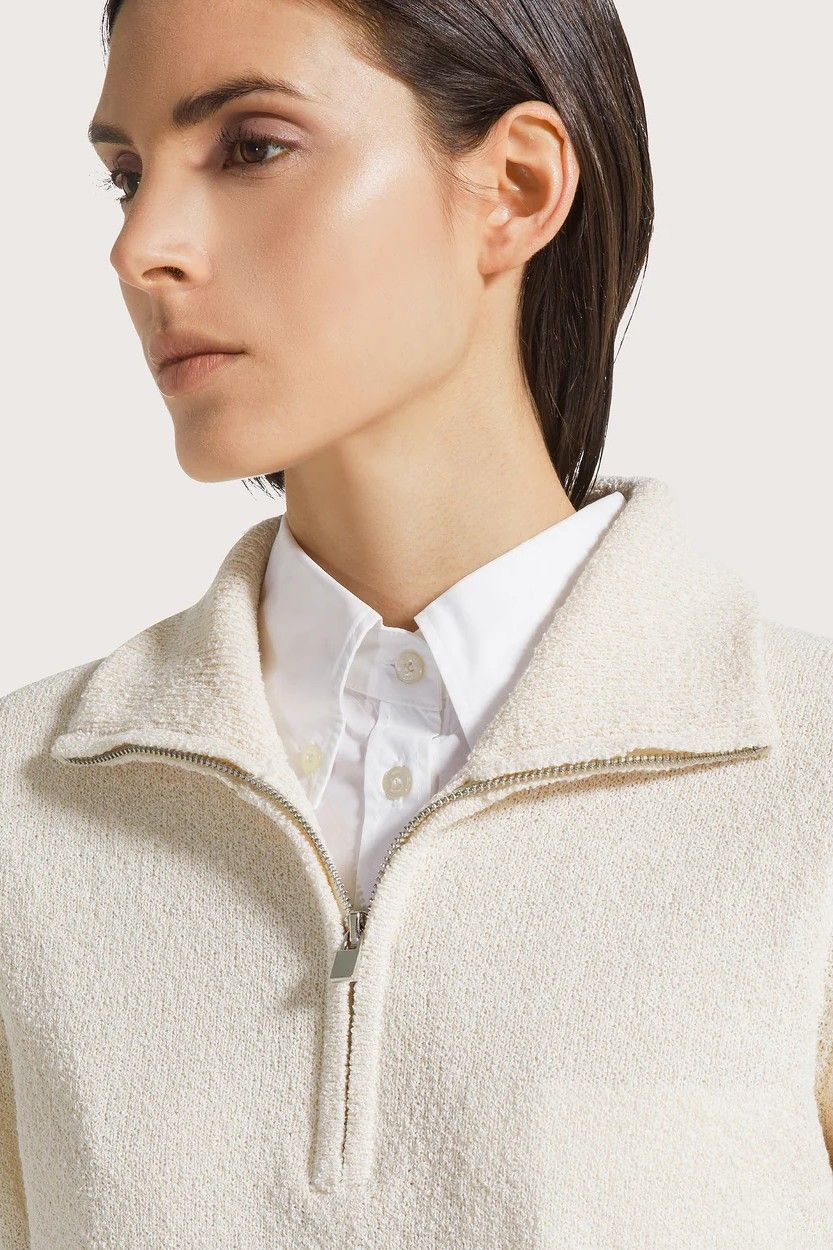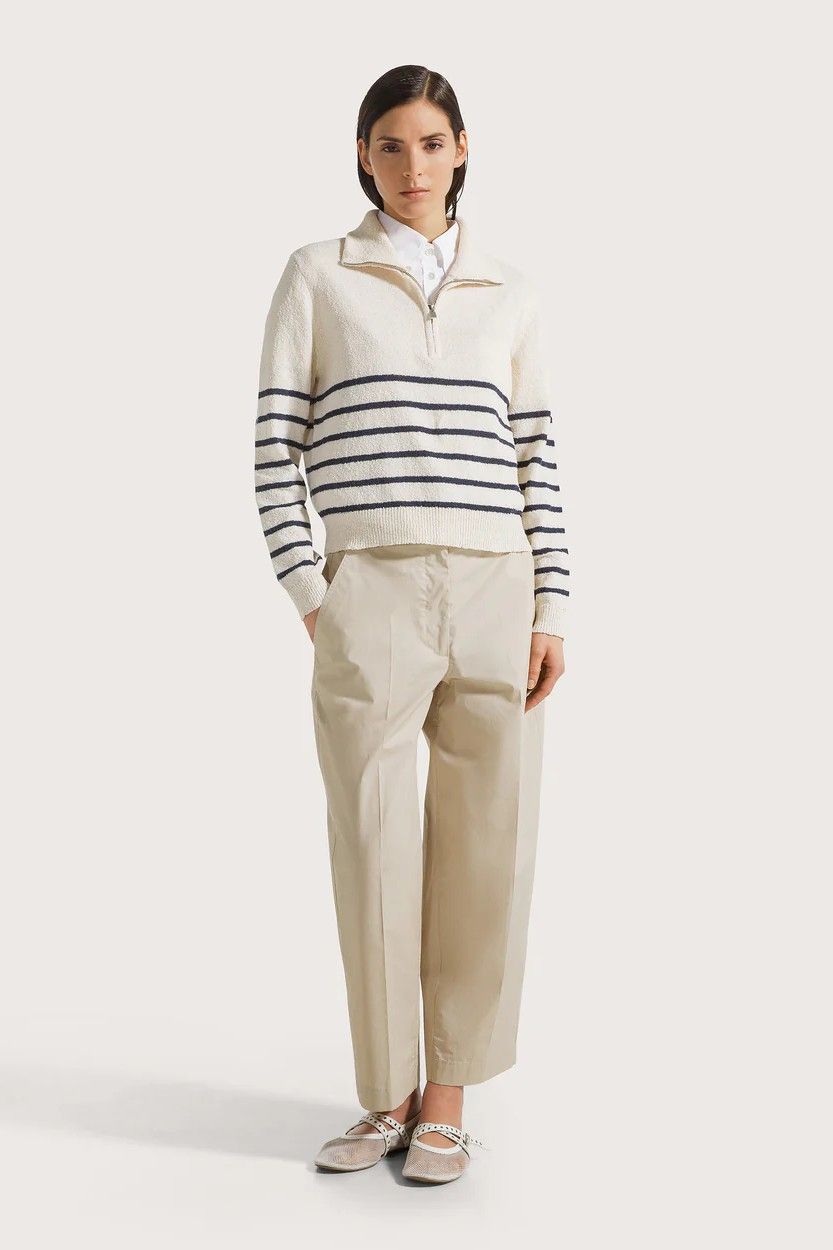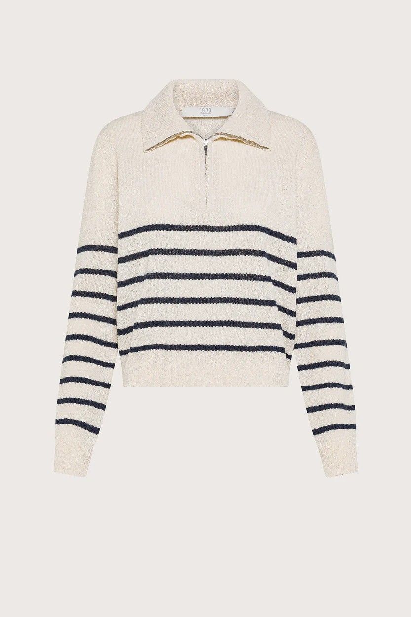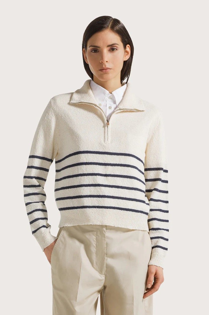 Pull esprit marin 1970 SEVENTY en maille douce écrue à rayures bleu marine, doté d’un col camionneur zippé pour une touche moderne. Confortable et facile à porter, il apporte une allure chic et décontractée à toutes vos tenues.