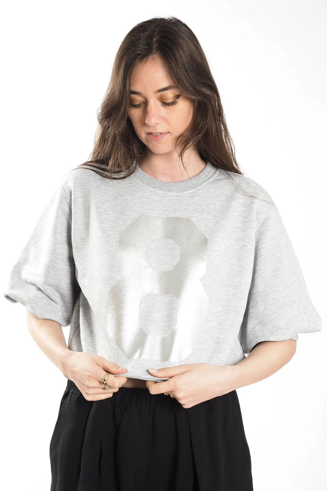 Un incontournable de la marque 8PM avec son logo “8” à l’avant, ce sweat gris à manches courtes revisite le casual avec une touche moderne et distinctive.