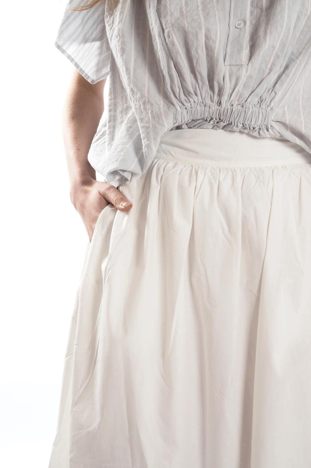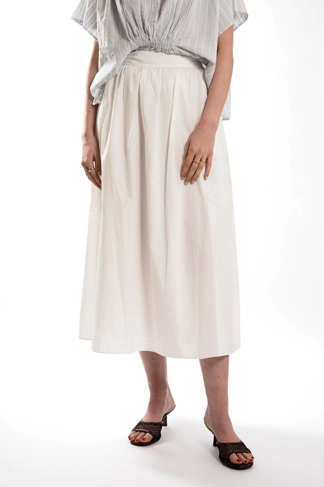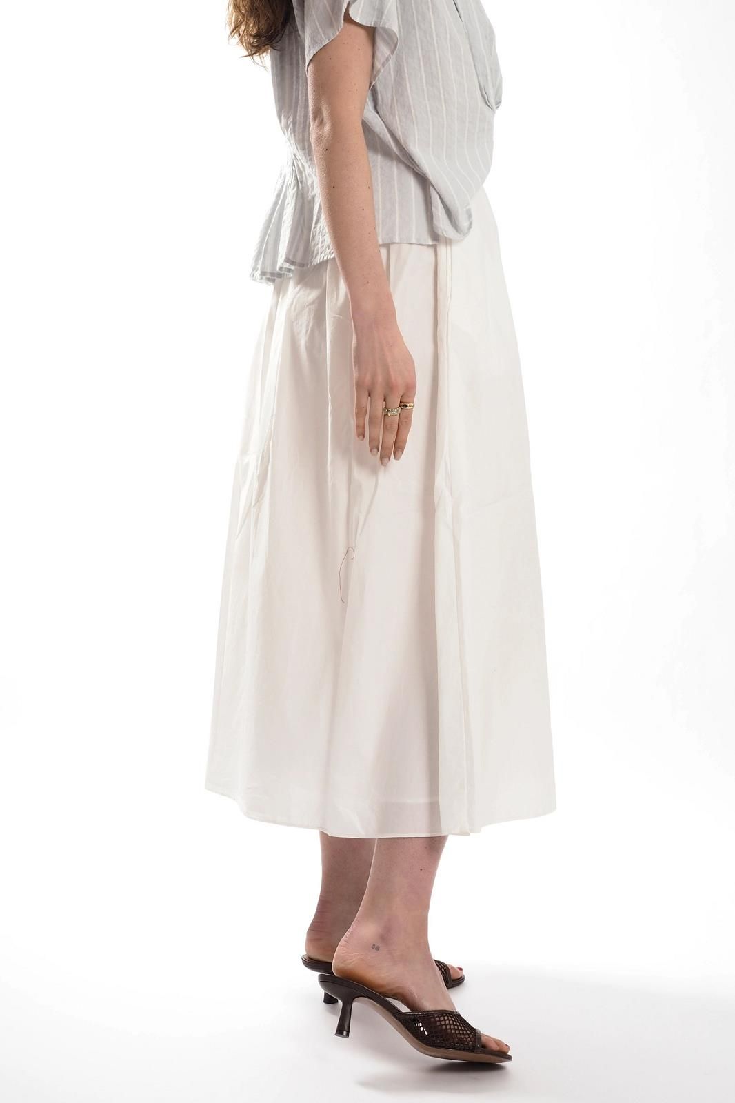 Cette jupe midi blanche en popeline de chez BELLEPIECE allie légèreté et élégance.