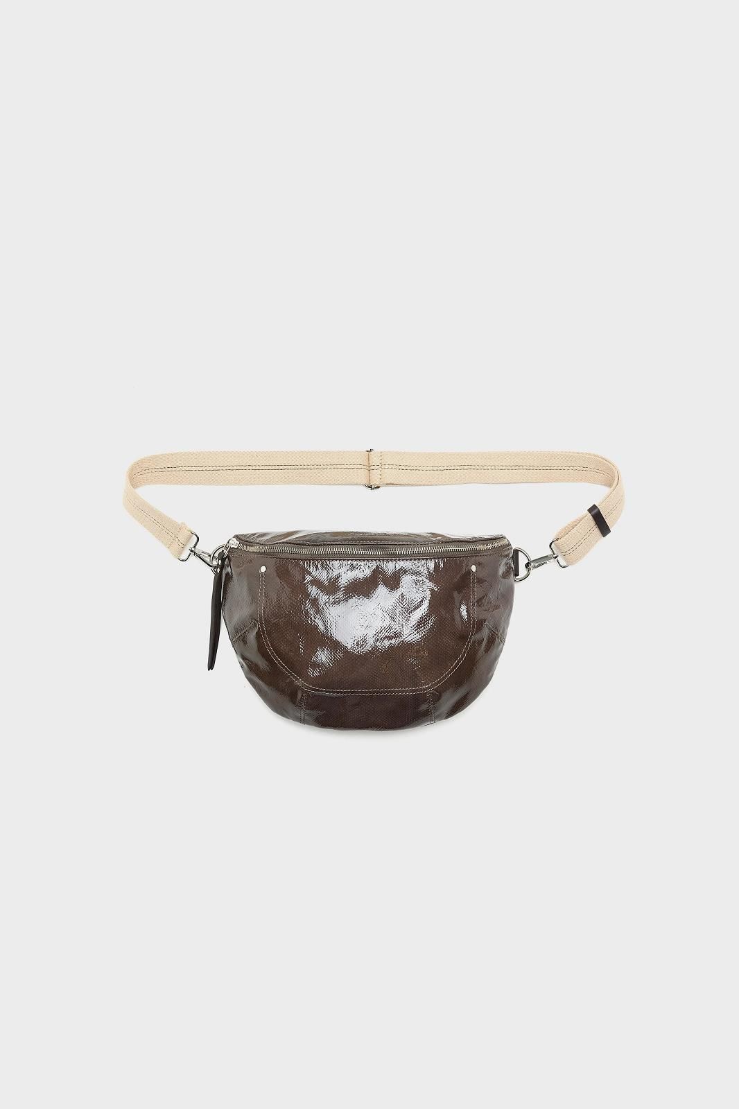 Sac à bandoulière souple en cuir laminé avec imprimé python gris-brun.