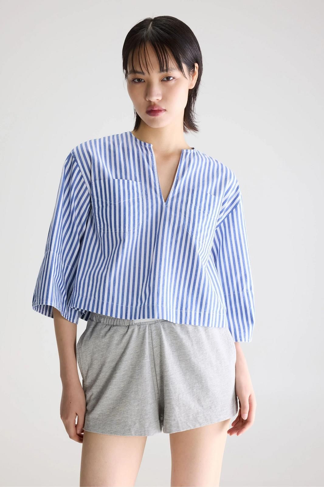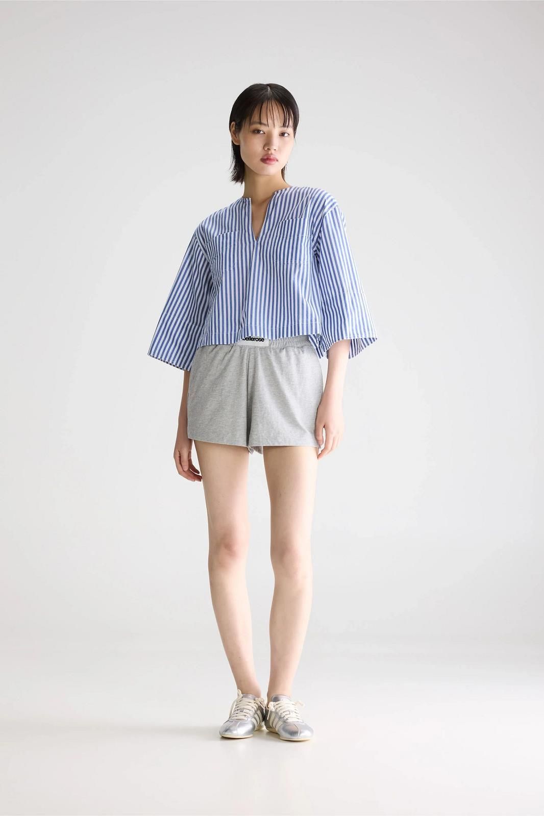 La chemise à lignes bleus et blanches de chez Bellerose représente l'élégance simple.