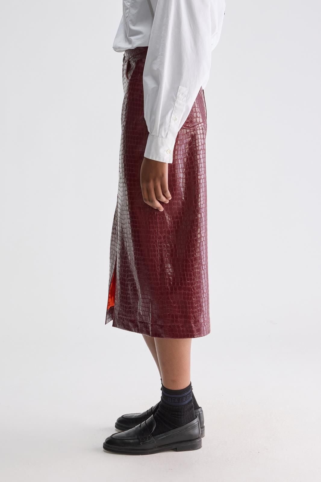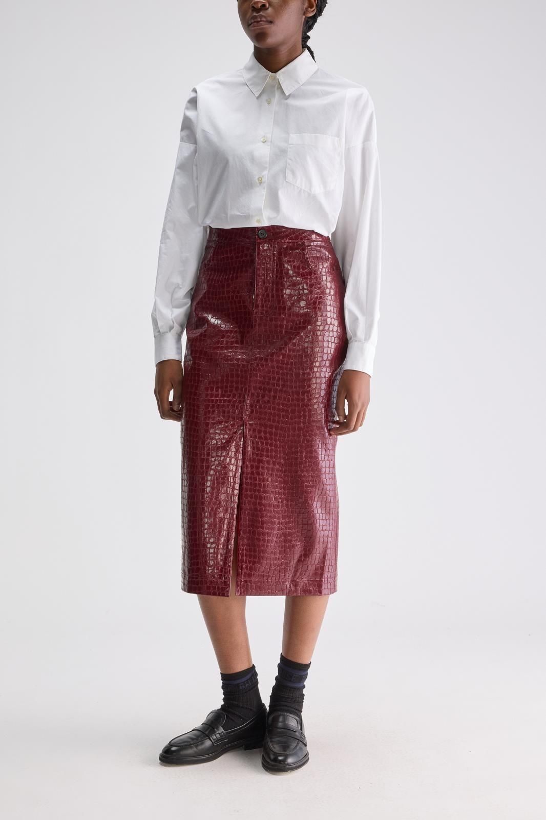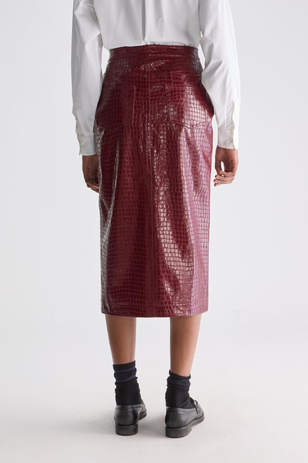 Jupe crayon Couleur bordeaux Motifs croco Matière éco-cuir