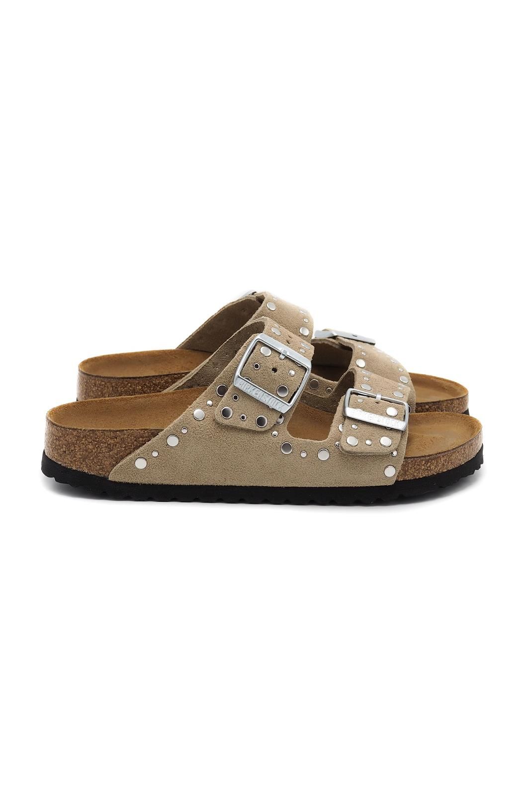 Sandales deux boucles avec rivets taupe BIRKENSTOCK, au design emblématique revisité.