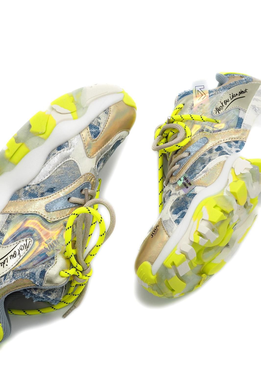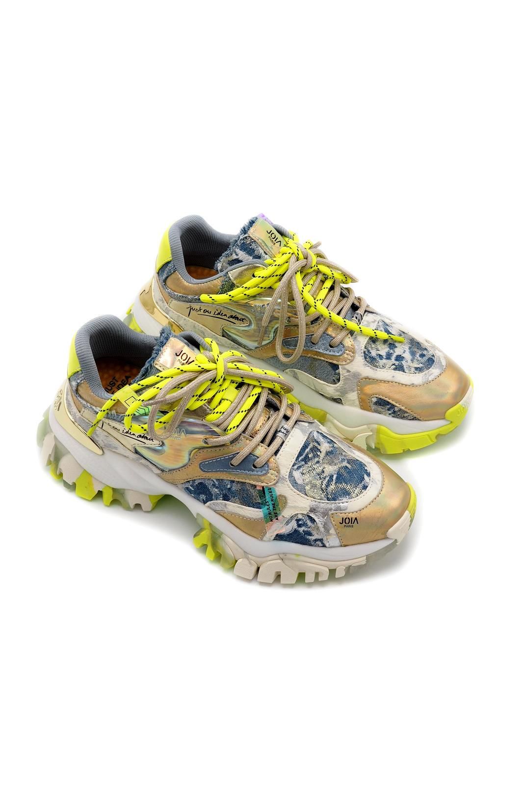 Des chaussures pétillantes, solaires et originales... C'est ce que vous propose la marque JOIA avec cette basket unique en son genre. Le jeux de matières, de couleurs et de textures en font une pièce vraiment pas comme les autres.