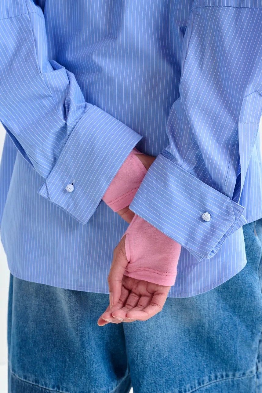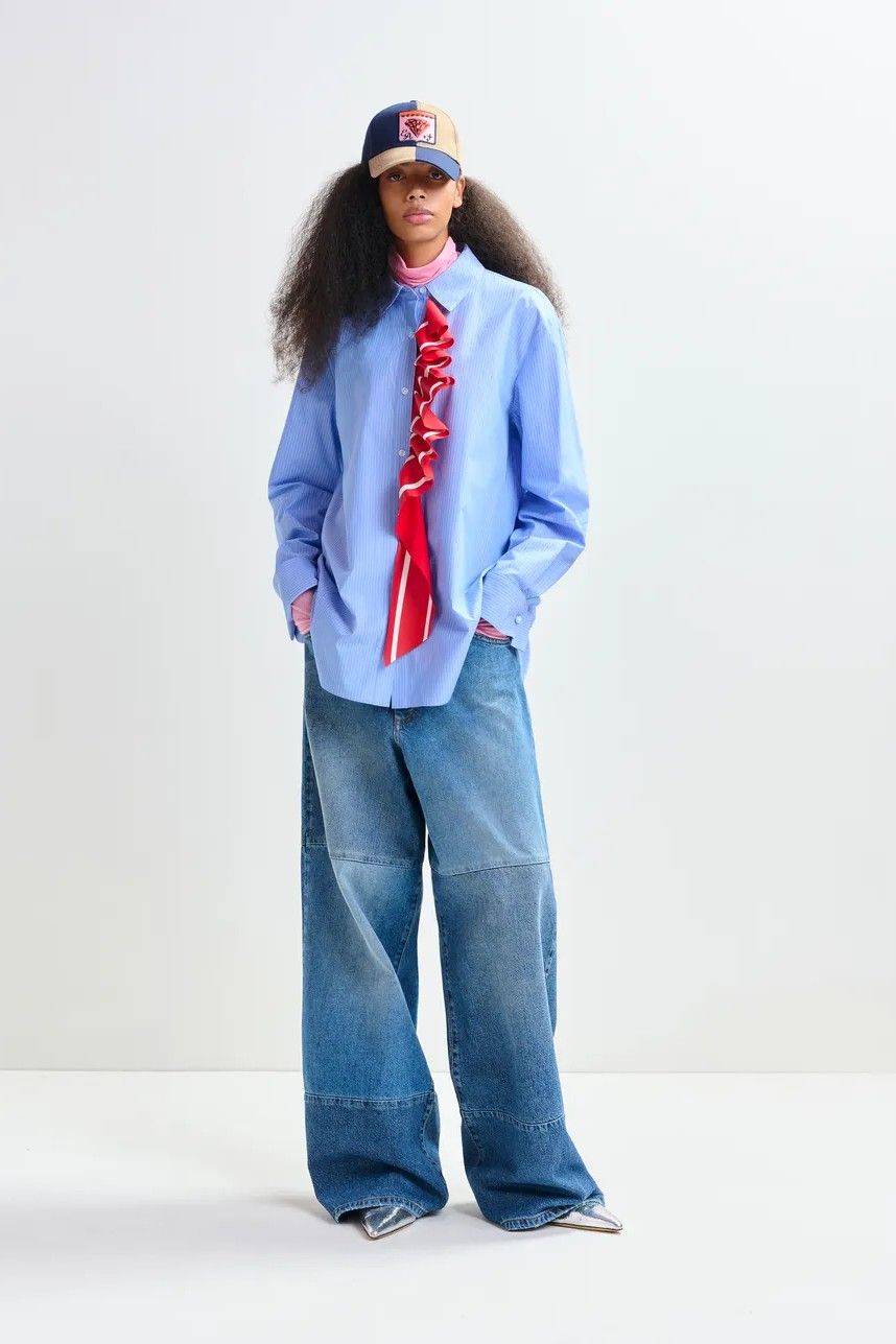 Chemise à fines rayures bleue et blanche avec détail de volant