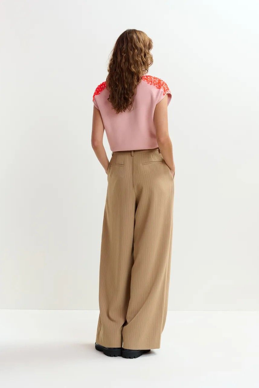 Ce top rose poudré Essentiel Antwerp allie confort et élégance avec sa coupe fluide et son col polo. Les sequins oranges et les perles aux épaules apportent une touche lumineuse et originale.