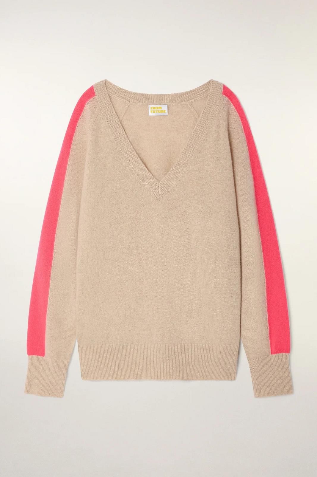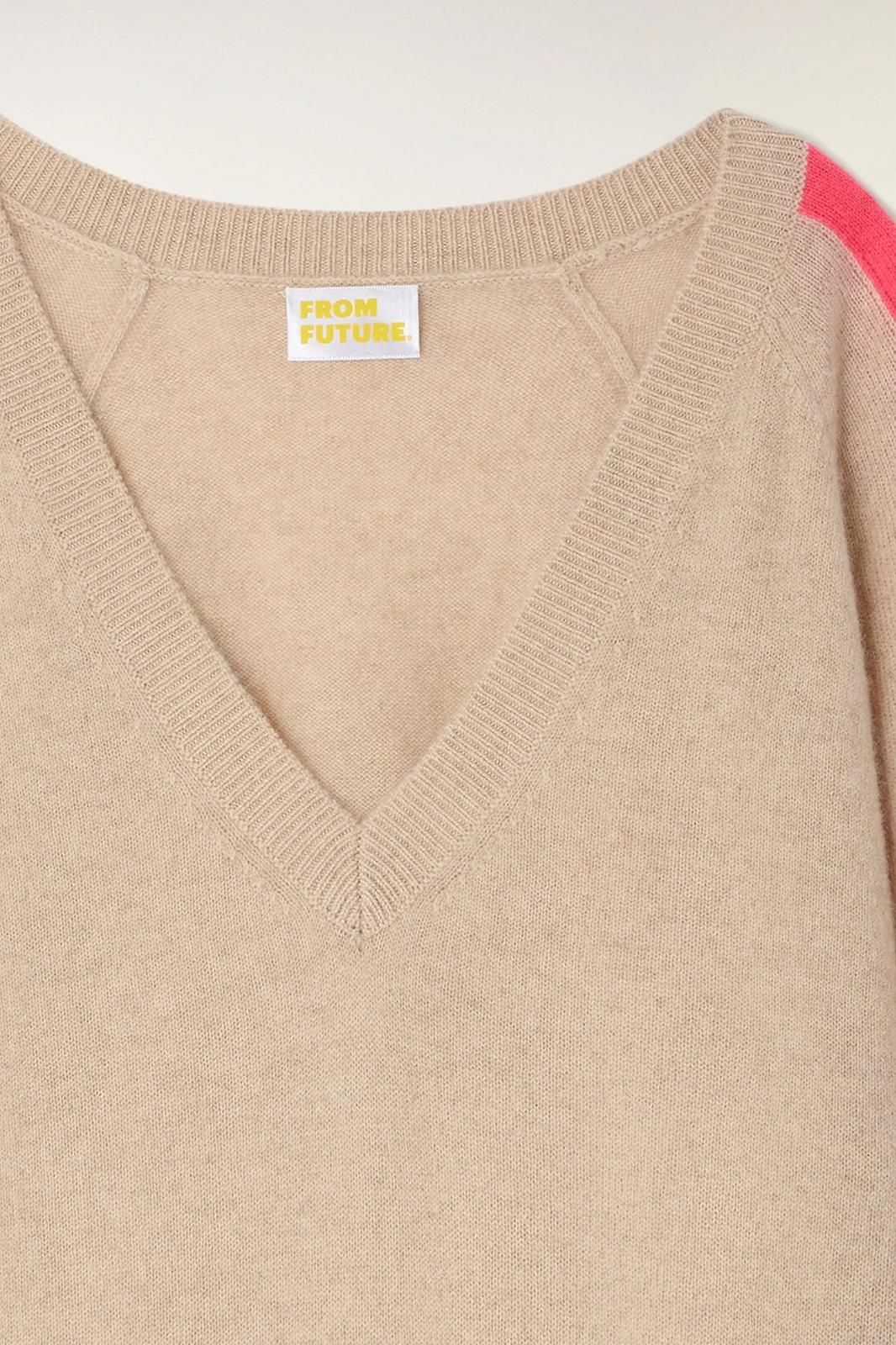 Ce pull en cachemire classique est signé FROM FUTURE avec sa bande corail sur les manches. Un beau compromis pour l'entre-saison entre douceur et couleurs pep's.