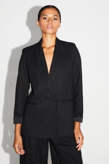 Double boutonnage avec boutons noirs embossés d’un blason, finition mate