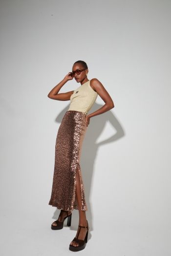 Captivez les regards avec cette jupe longue à sequins bronze de la marque IMPREVU. Elle à un coté sensuelle grace à sa fente sur le côté.