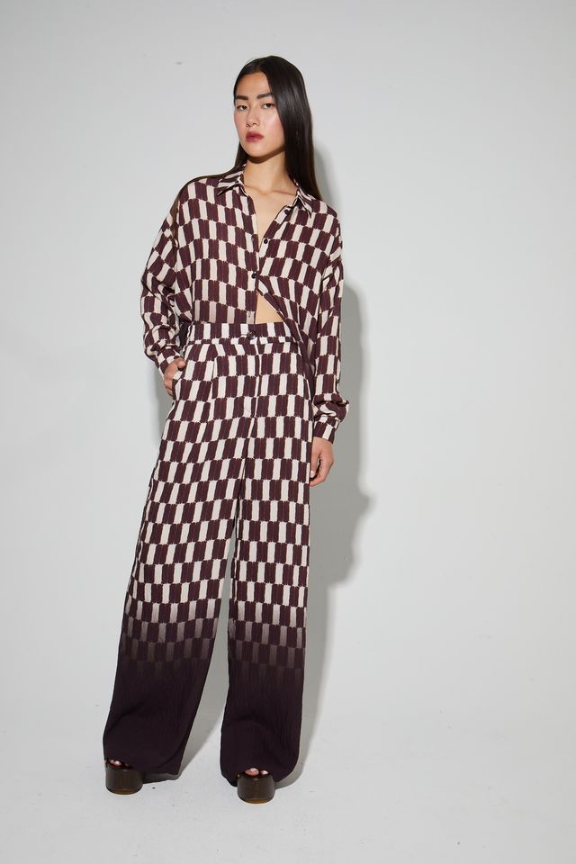 Pantalon Tye & Dye IMPREVU en damier chocolat, taille haute et coupe large fluide pour un look street-chic audacieux et contemporain.