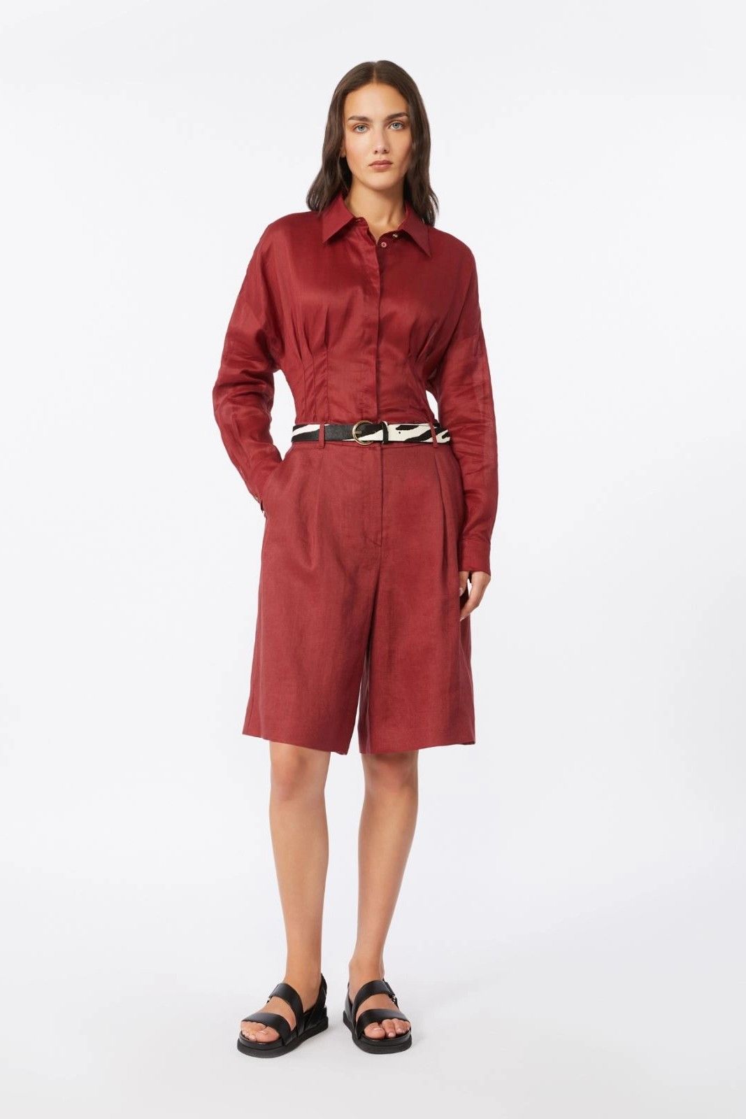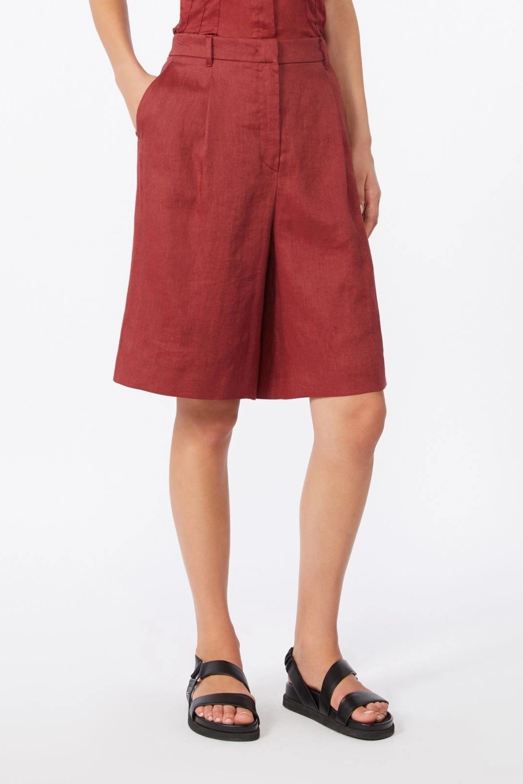 Ce bermuda rouge brique illuminera votre tenue. On le porte avec un haut blanc ou marron, une paire de basket, de sandale ou même un petit slingback pour donner une allure plus habillée.