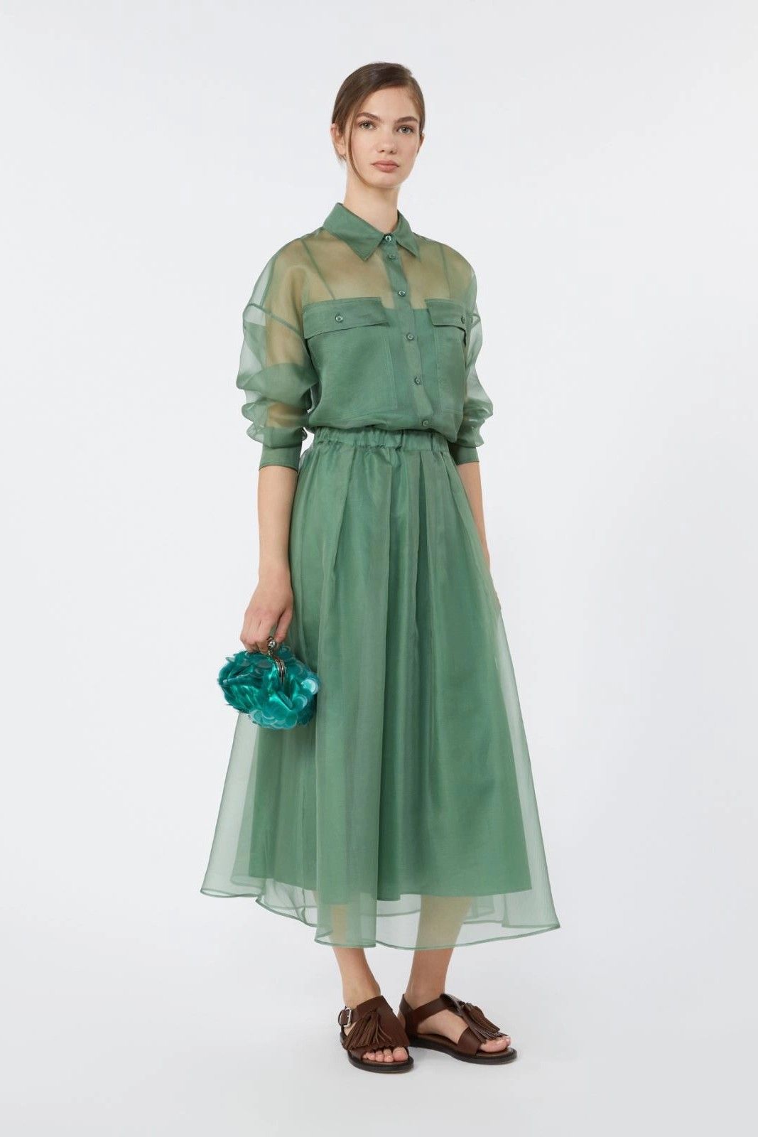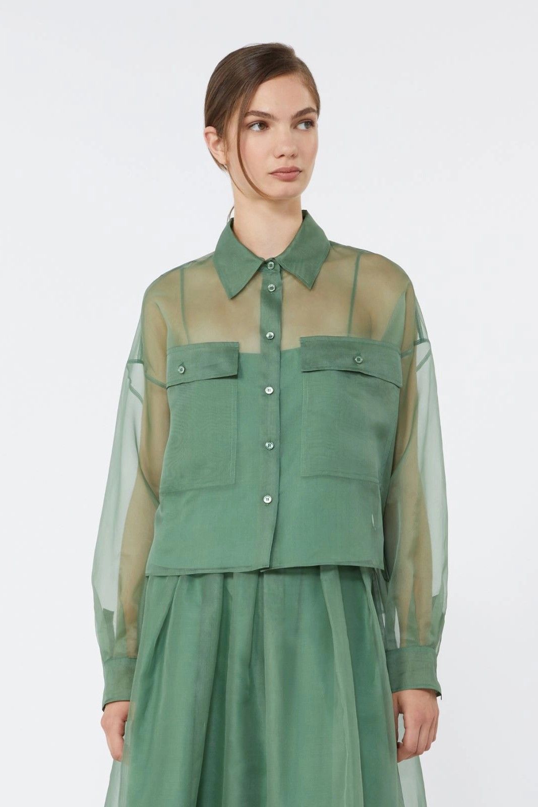 Cette chemise crop en organza vert emeraude de chez Maxmara avec le débardeur assorti par dessous est un idéal chic pour vos tenues.