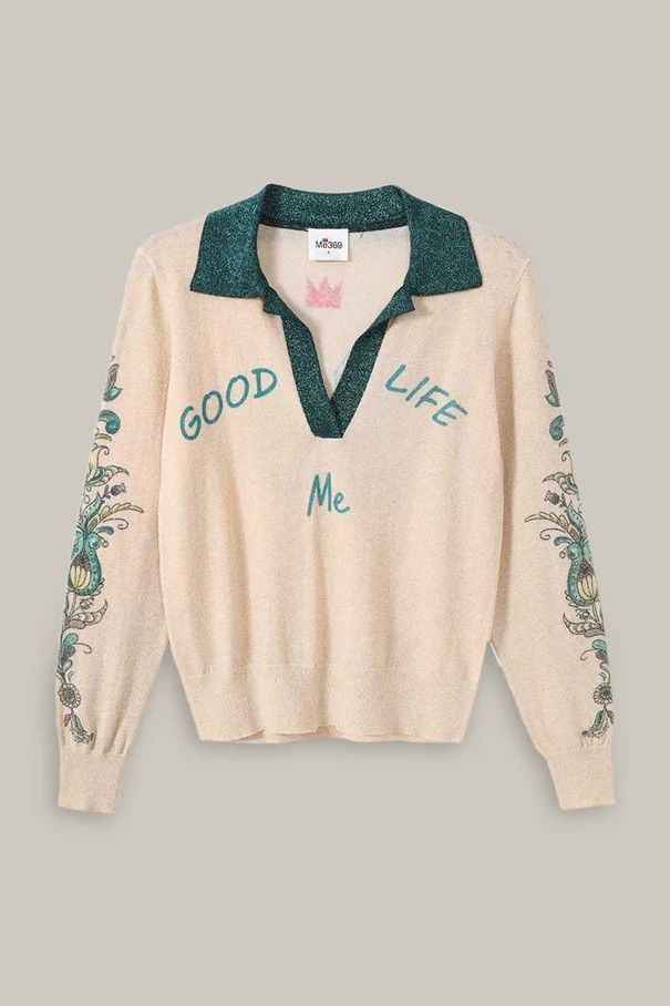 Pull polo Couleur écru Bords glitter vert émeraude