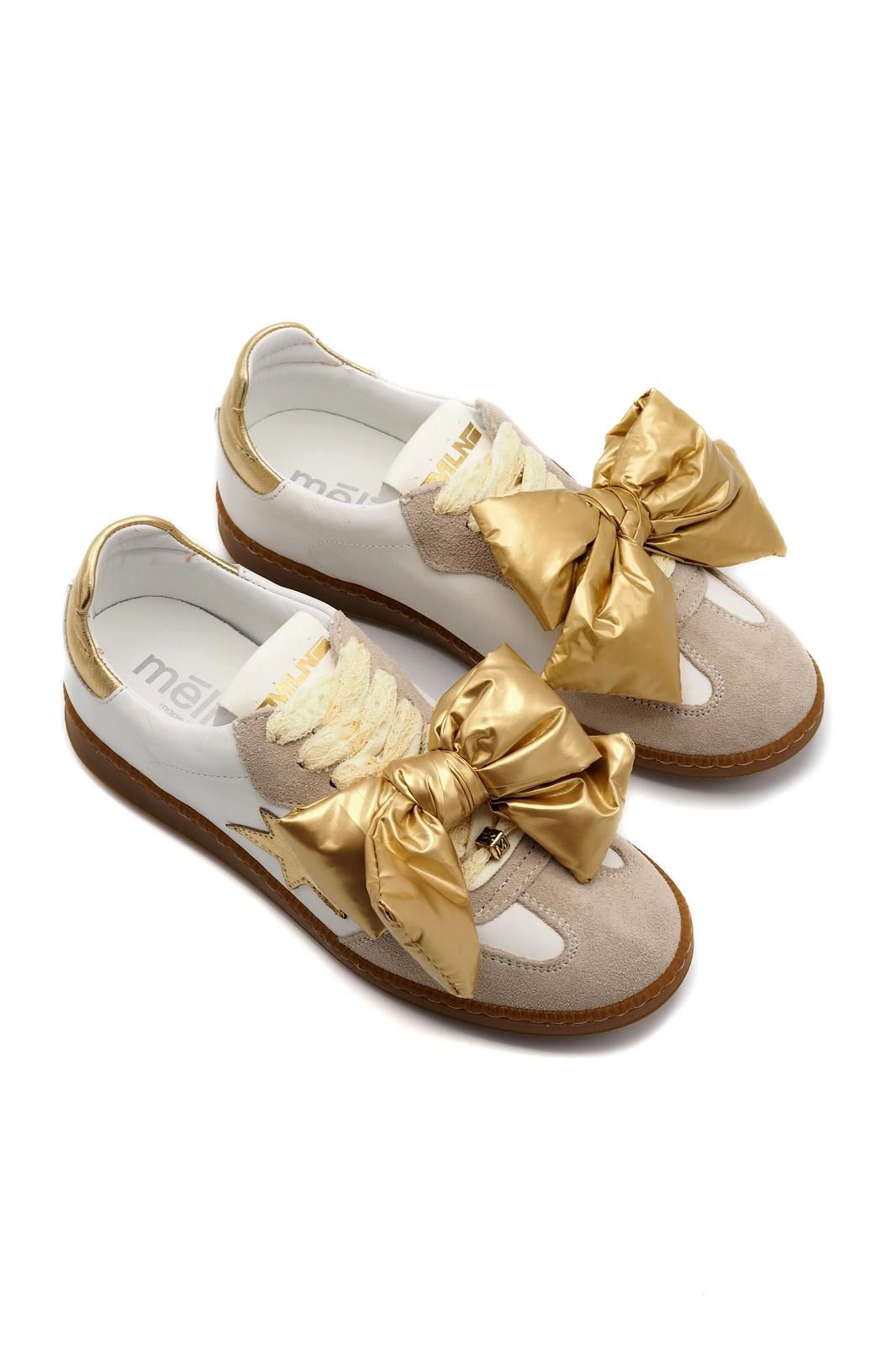 Cette basket blanche et dorée de la marque MELINE à un style audacieux et élégant. Un gros noeud doré peut être ajouté sur la chaussure, pour un look encore plux extra.