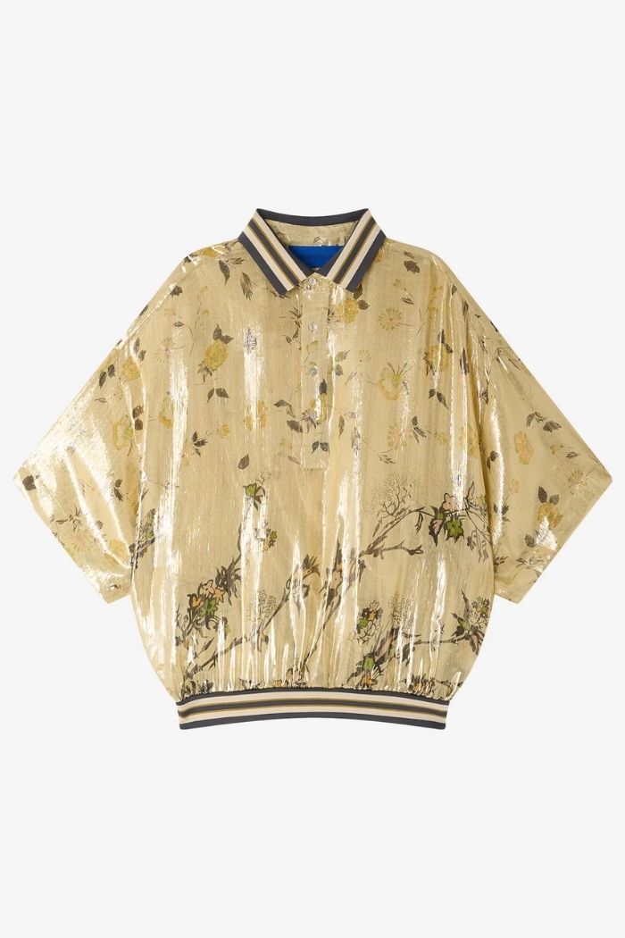 Une chemise en soie solaire et lumineuse signée Mes Demoiselles. Le polo sportif est ici revisité dans une tournure chic et décontractée. La matière et les motifs de la chemise alliés aux ourlets et au col sportif en font une pièce unique qui attire l'oeil sans en faire trop. On la porte avec le pantalon accordé pour un ensemble estival ou sur un jeans noir pour un look plus sportif.