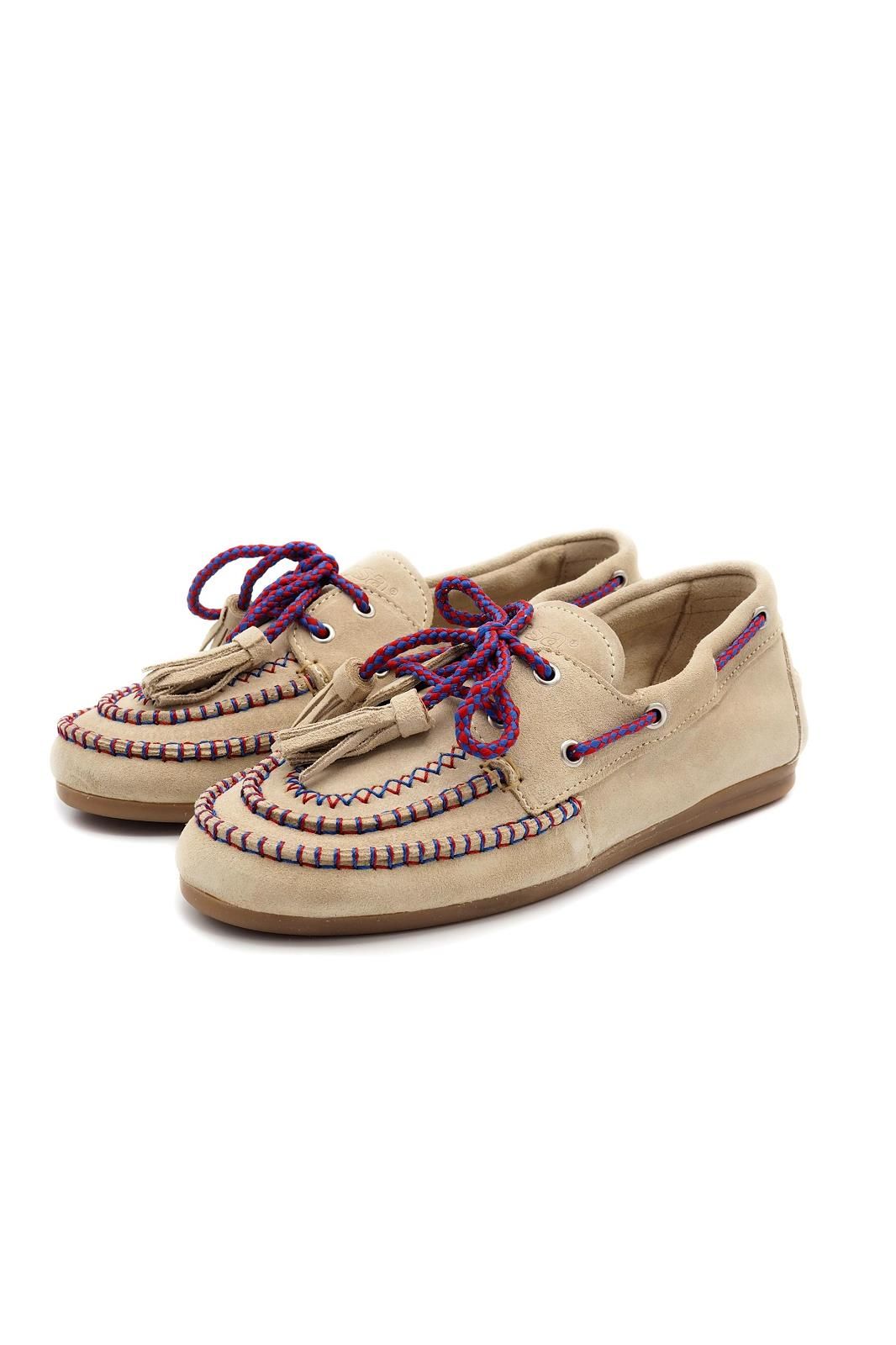 Ces mocassins en nubuck beige avec surpiqûres mauves signés POSA affichent un style inspiré des motifs indiens, à la fois original et irrésistible.