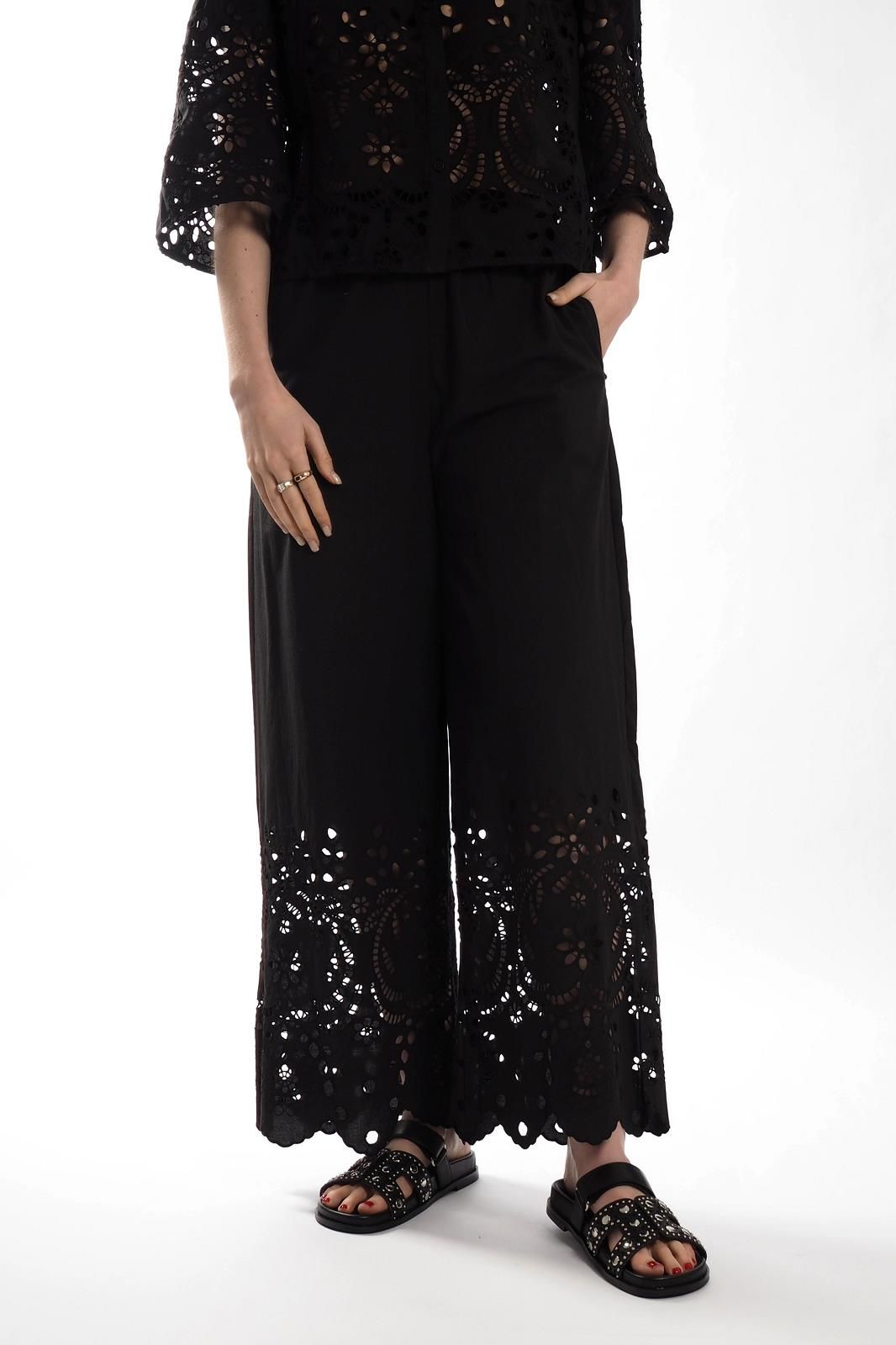 Pantalon SEE U SOON noir, ajouré et brodé, mêlant élégance et style estival sophistiqué.