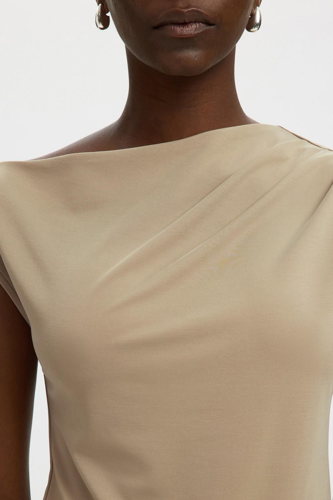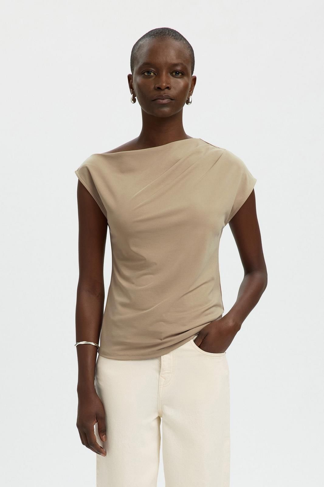 Blouse asymétrique sans manches SELECTED. La marque propose une blouse très élégante, avec des épaules asymétriques. Elle se porte sur un pantalon, un jeans, une jupe et même un short habillé. Elle s'adapte à votre style !