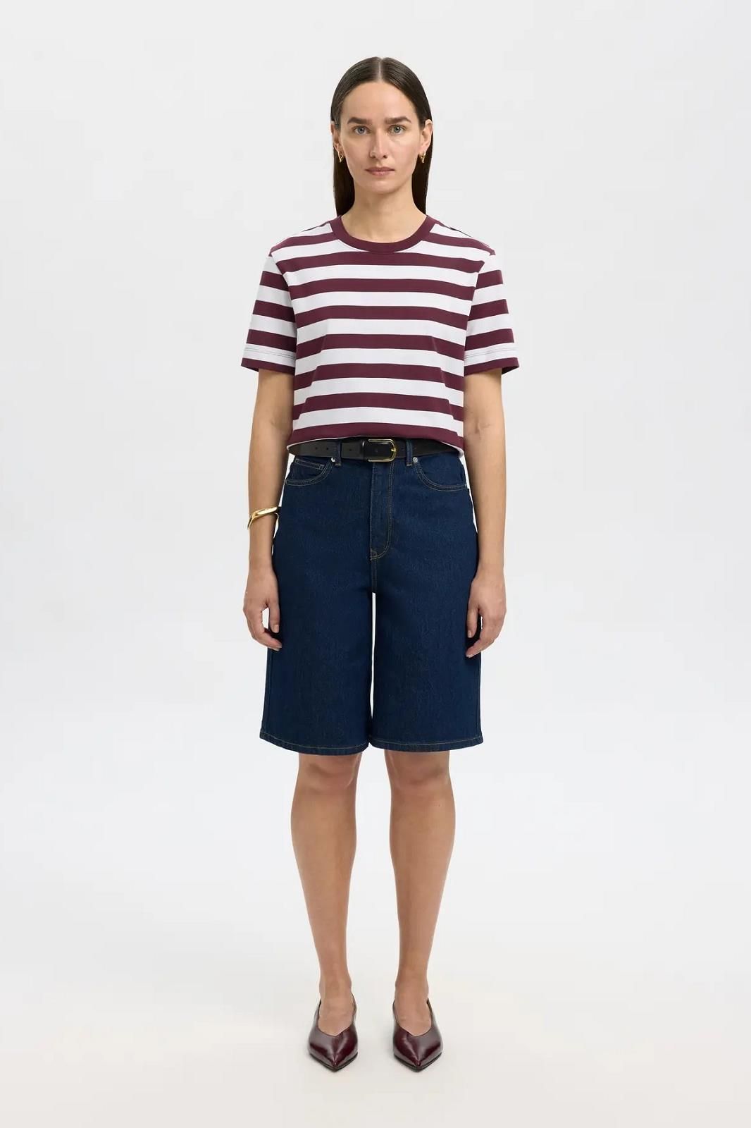 Tee-shirt ligné SELECTED. Une nouvelle version de la marinière en brun. Idéale à porter en été grâce à sa matière légère et sa coupe courte un peu loose. Avec ses couleurs naturelles, on le porte jusqu'en automne avec un beau blazer.