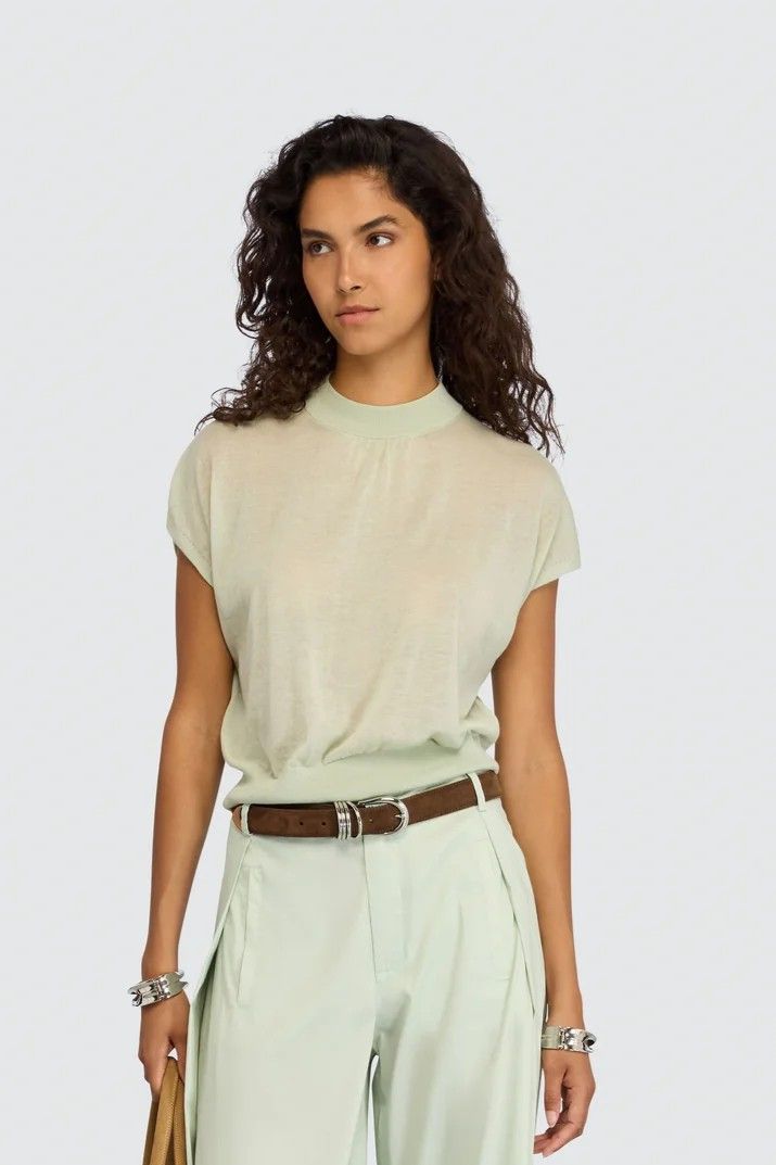 Blouse vert menthe en maille transparente signée SEMI COUTURE, à l’allure légère et sophistiquée. Une pièce délicate qui sublime instantanément la silhouette.