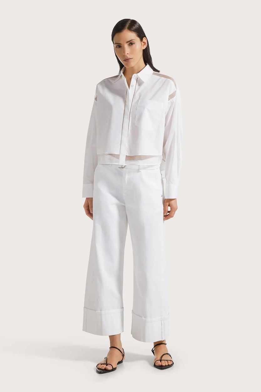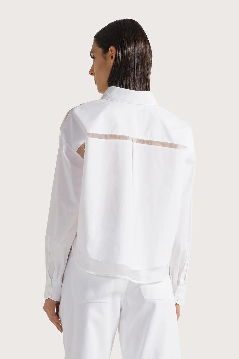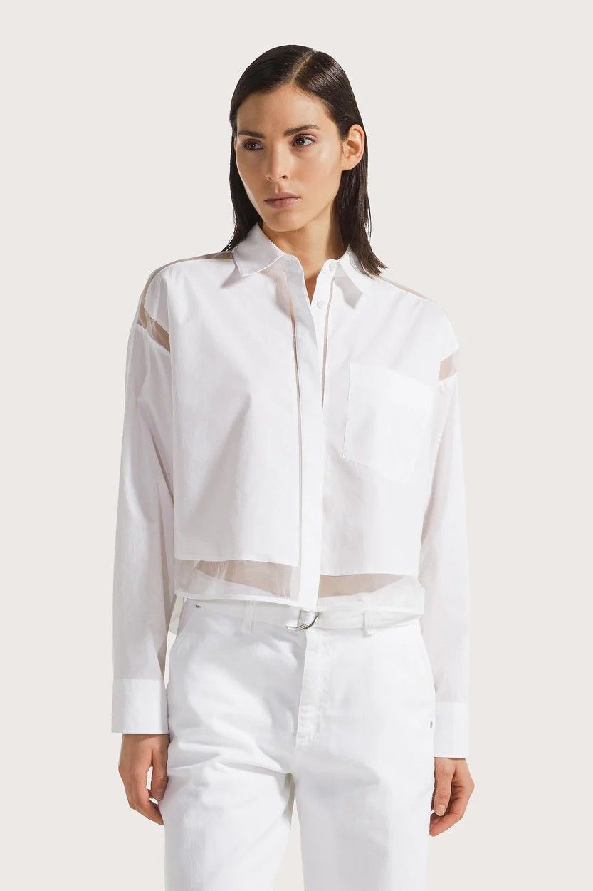 Chemise courte blanche en popeline SEVENTY, sublimée par des détails en organza transparent aux motifs géométriques. Une pièce moderne et élégante qui apporte une touche d’originalité à votre tenue.