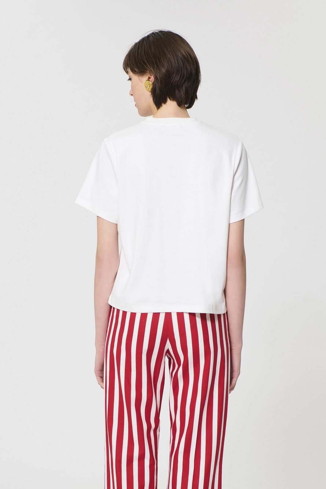 Sobriété et punch se rencontrent dans ce t-shirt blanc TARA JARMON à inscription rouge, parfait pour twister une tenue du quotidien avec style.