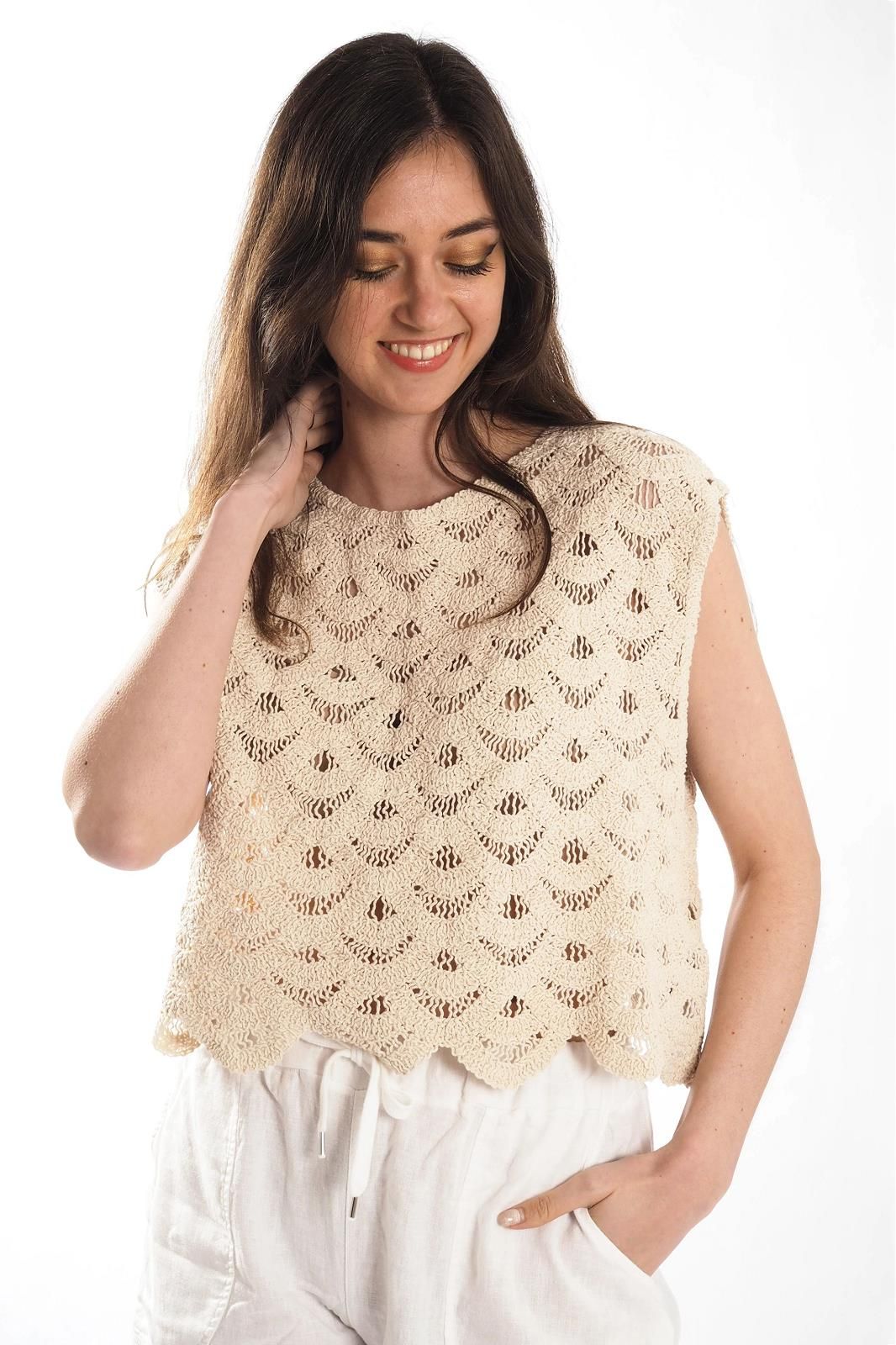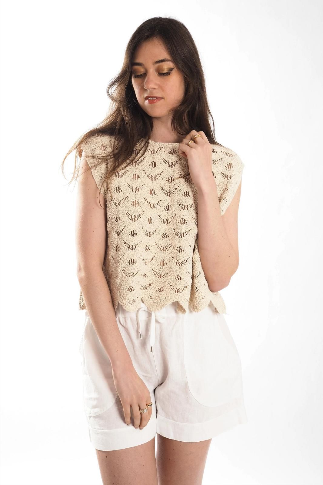 Ce petit top en crochet couleur crème THE KORNER est à la fois délicat et tendance. Sa maille ajourée apporte une touche bohème parfaite pour les beaux jours.