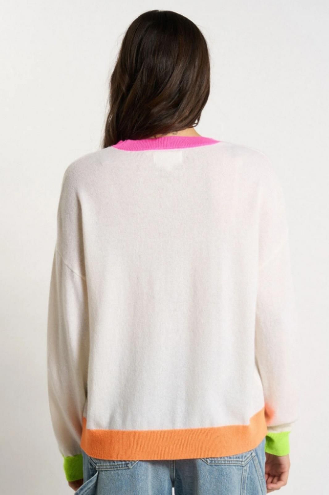 Ce petit pull a une couleur de base neutre et claire, relevé par des ourlets multicolores roses, oranges et verts. C'est la pièce à adopter pour l'entre-saison : chaud et doux et présente des couleurs pep's !