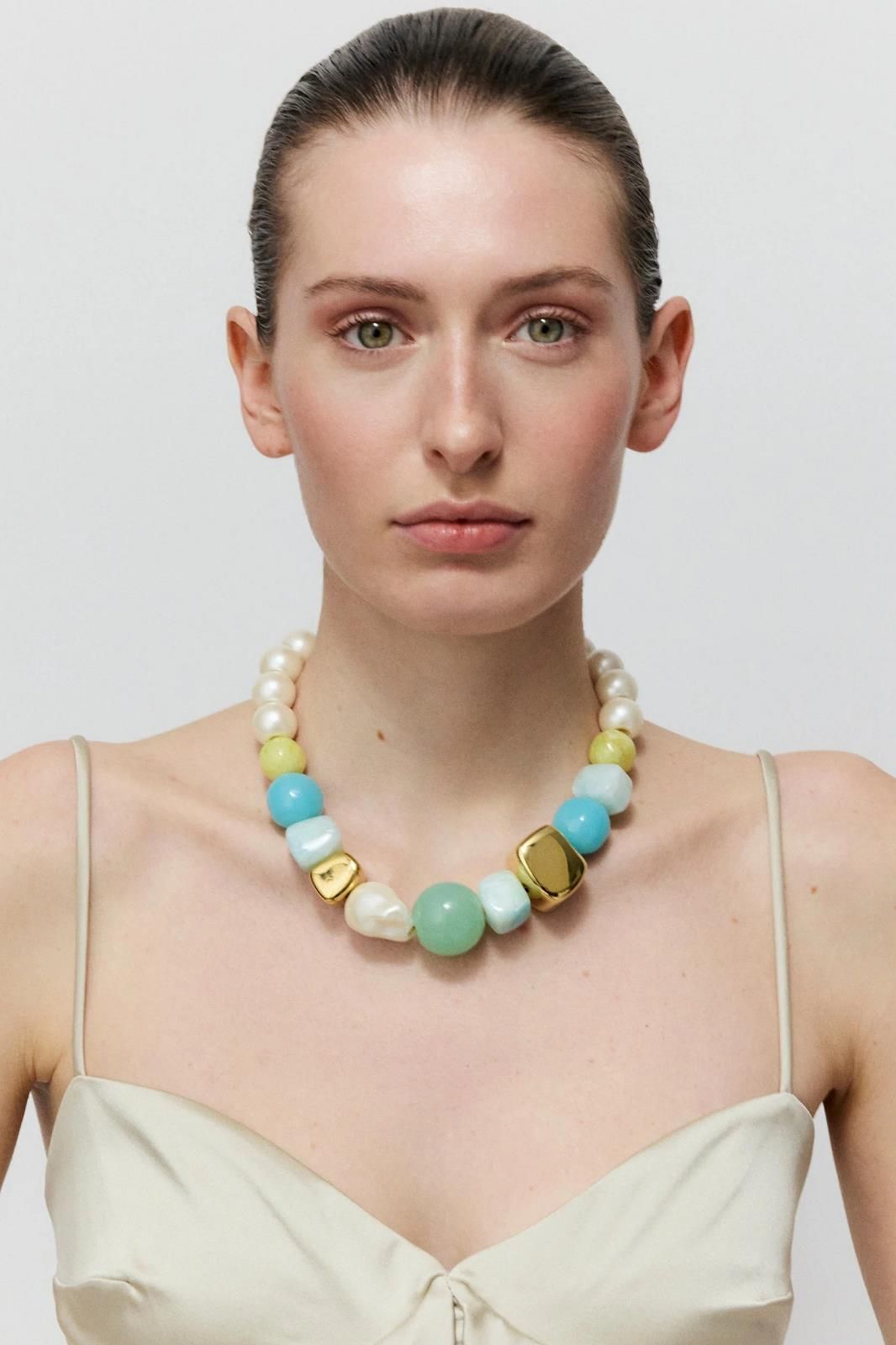 Un collier qui joue avec les couleurs estivales et les tailles de pierre pour un effet moderne et surprenant.