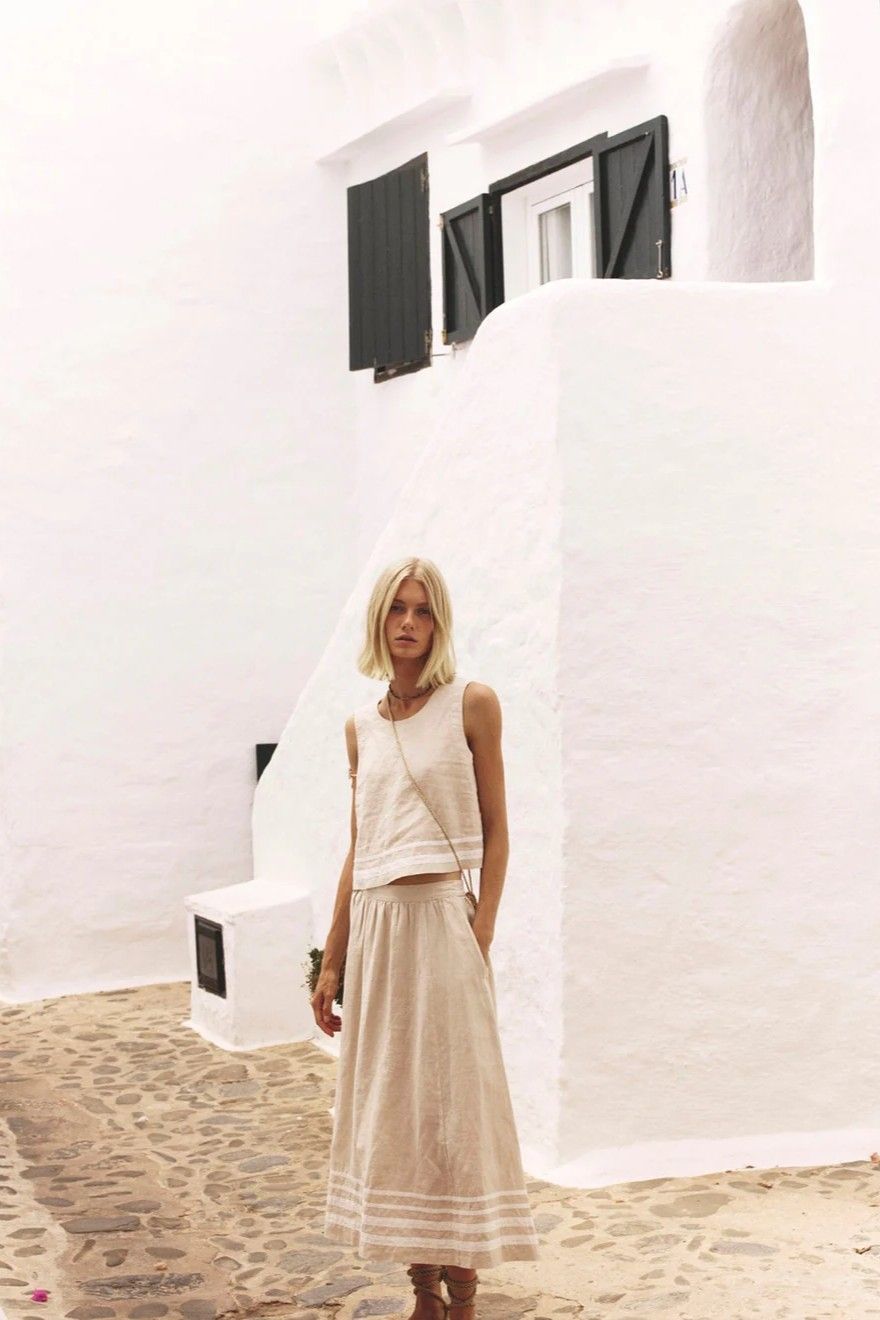 Le top écru 100% lin de chez Xirena se coordonne parfaitement avec la jupe assortie ou se porte avec un jean pour un look plus décalé.