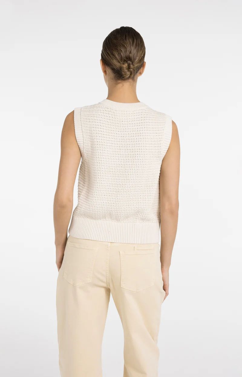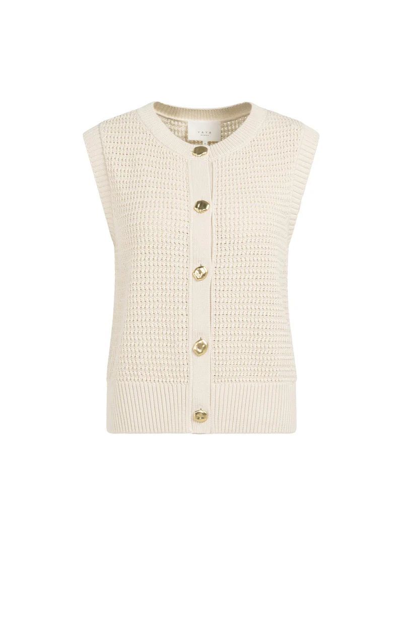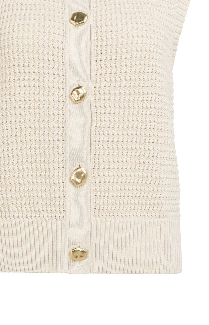 Ce cardigan sans manches est élégant et se porte à merveille avec un joli pantalon ou sur un short clair en été. On peut le porter également sur une chemise. Ses boutons sont de véritables bijoux !