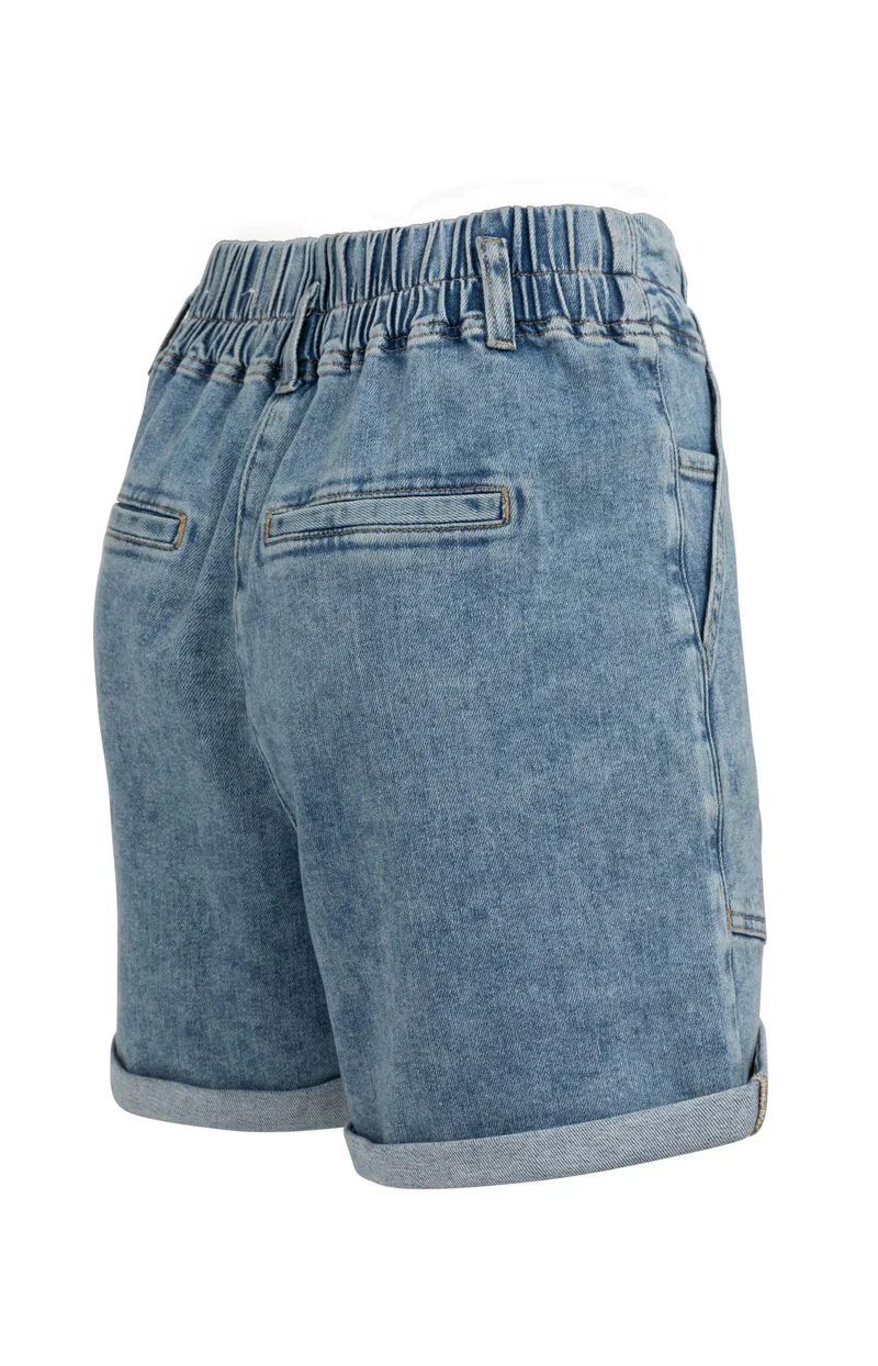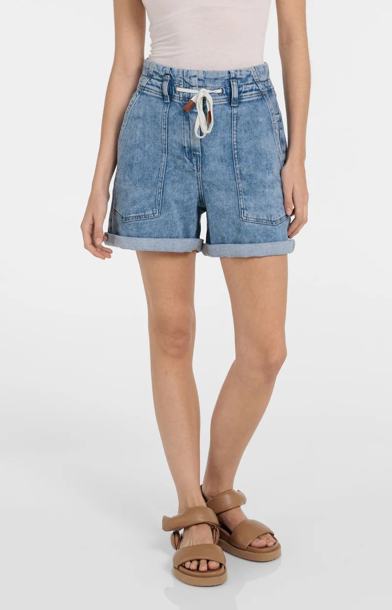 Short en jeans décontracté avec un cordon blanc à la taille. Il présente de grandes poches plaquées à l'avant.