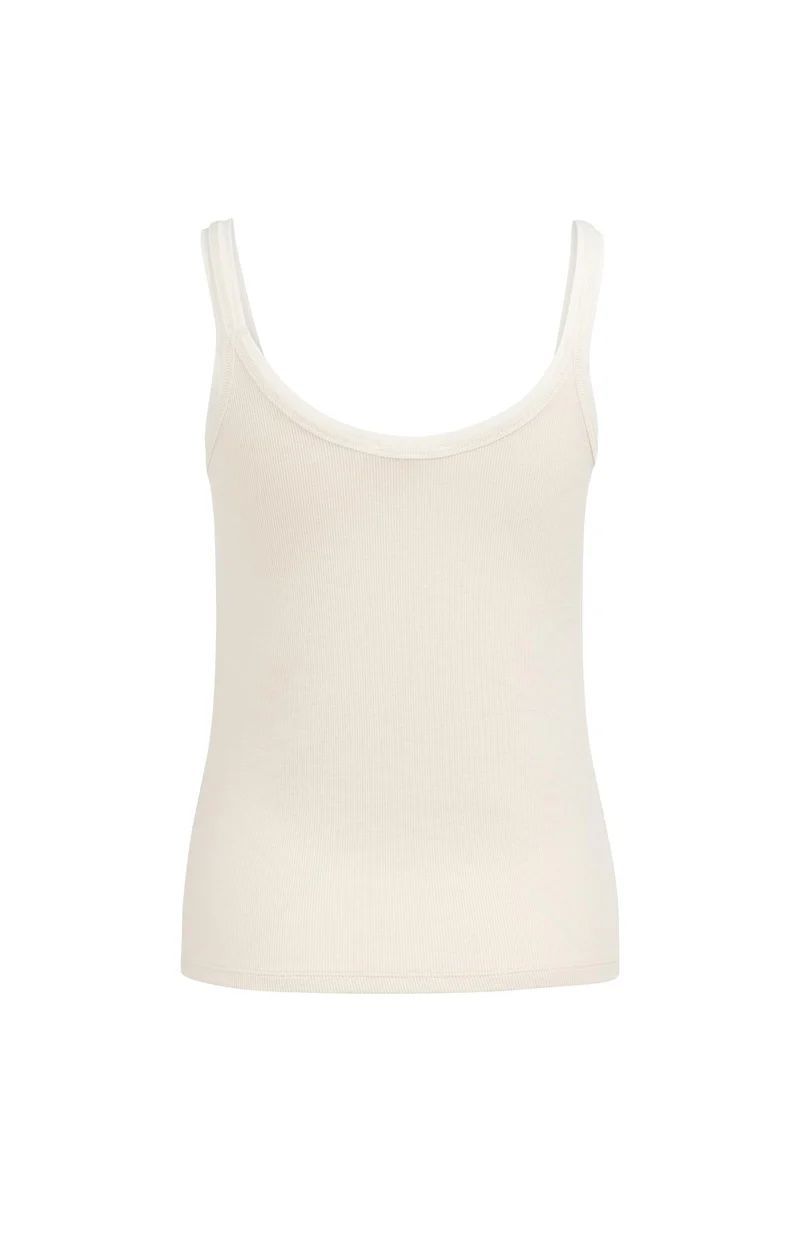 Débardeur beige à mailles fines. Un basique à glisser sous une veste en été, ou bien sur une blouse assortie. Les coutures du haut du débardeur se démarquent pas une couleur légèrement différente.
