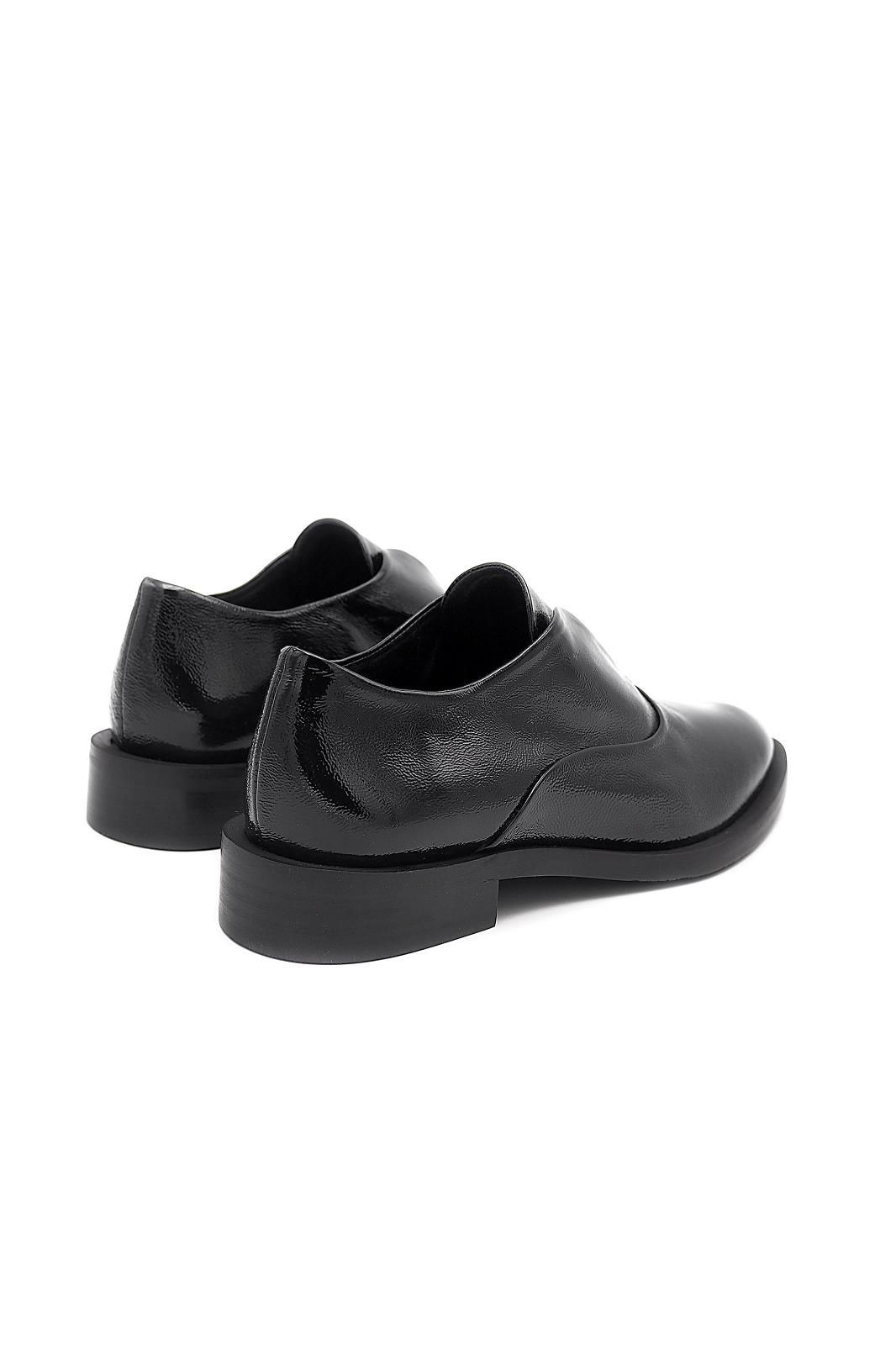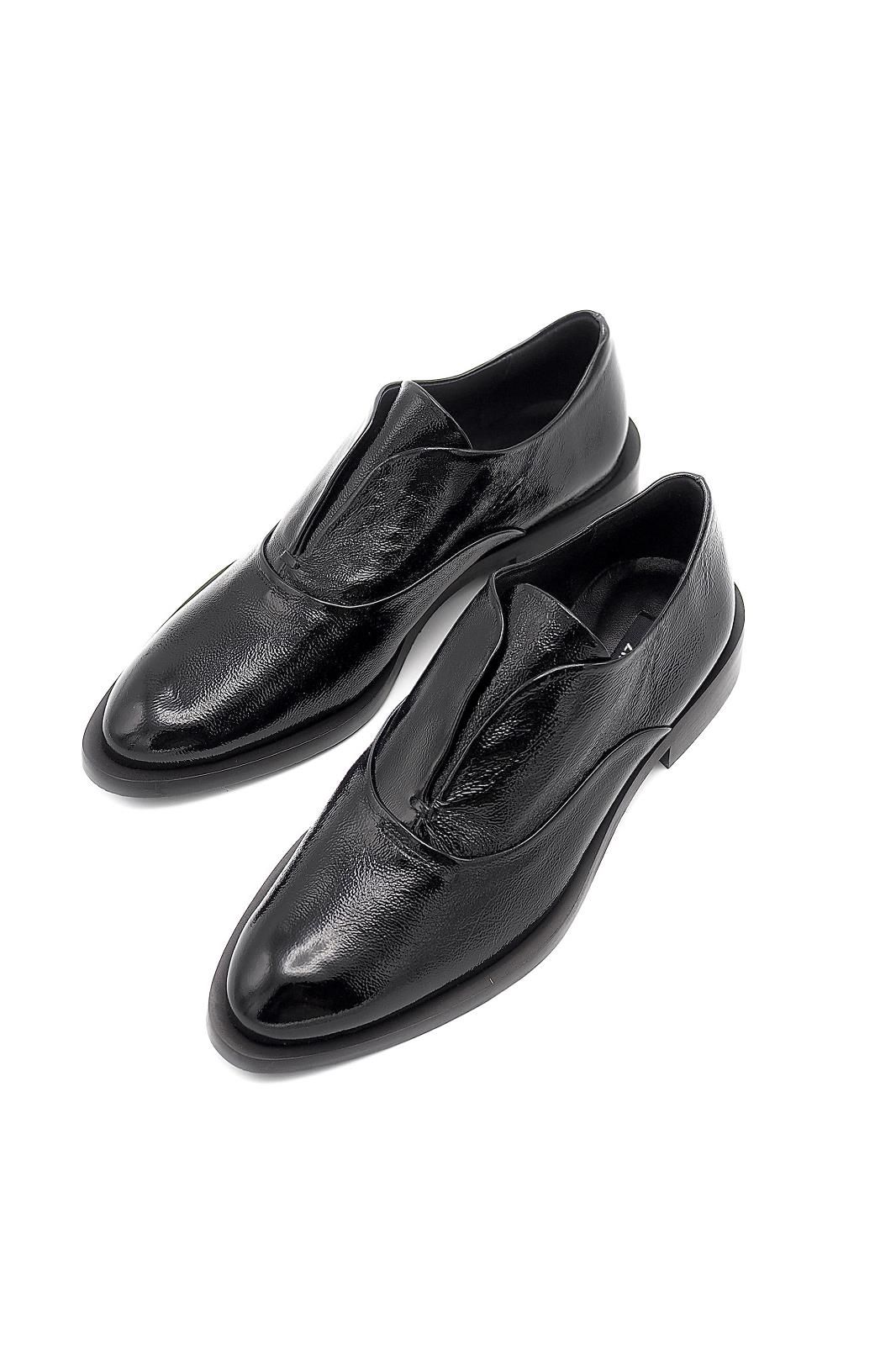 Mocassin en cuir vernis noir Détail sur le devant Modèle à enfiler Petit talon ton sur ton