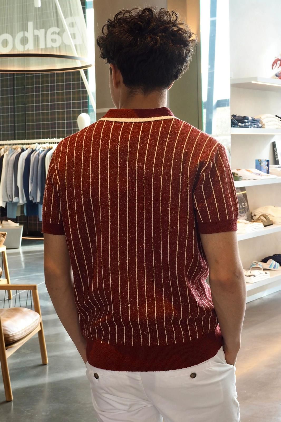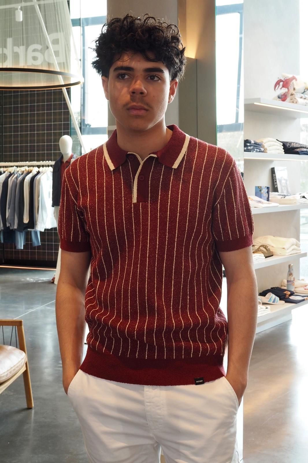 Ce polo en maille rayée à manches courtes, décliné dans un bordeaux profond par ANTWRP, est une vraie pépite. Portez le avec un pantalon ou un short blanc pour un maximum d'effet.